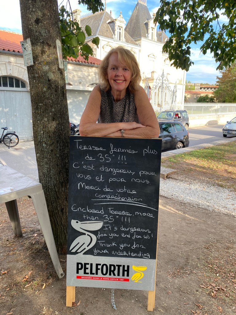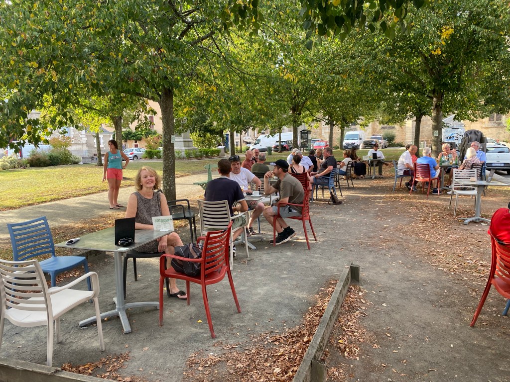 Reluctantly we left our beautiful chateau and cycled off in the dark mist again. The sunrise was beautiful, the fields bigger, the hedges lower and it’s still very rural with the sweet smell of silage wafting o er us as the huge tractors drove past us along the country lanes – all so familiar to us from Devon. It became far too hot to even contemplating walking around the Roman remains in Sanxay, so we chilled on the shady grass in the centre of town and cycled on. When we arrived at Lusignan, we headed straight to Intermarche to buy a lead to charge Neils lights and a power pack to charge our phones as we are both using them for navigation. From now on we’ll be much safer cycling in the dark and no more chatting up bar owners to charge me phone. The meal in our Chapeau Rouge hotel was as wonderful as advertised. Then straight to bed as it was so, so hot. I saw the kick off of the France NZ World Cup rugby match, then fell promptly asleep. Neil made it to half time before zzzzzzzzzz.