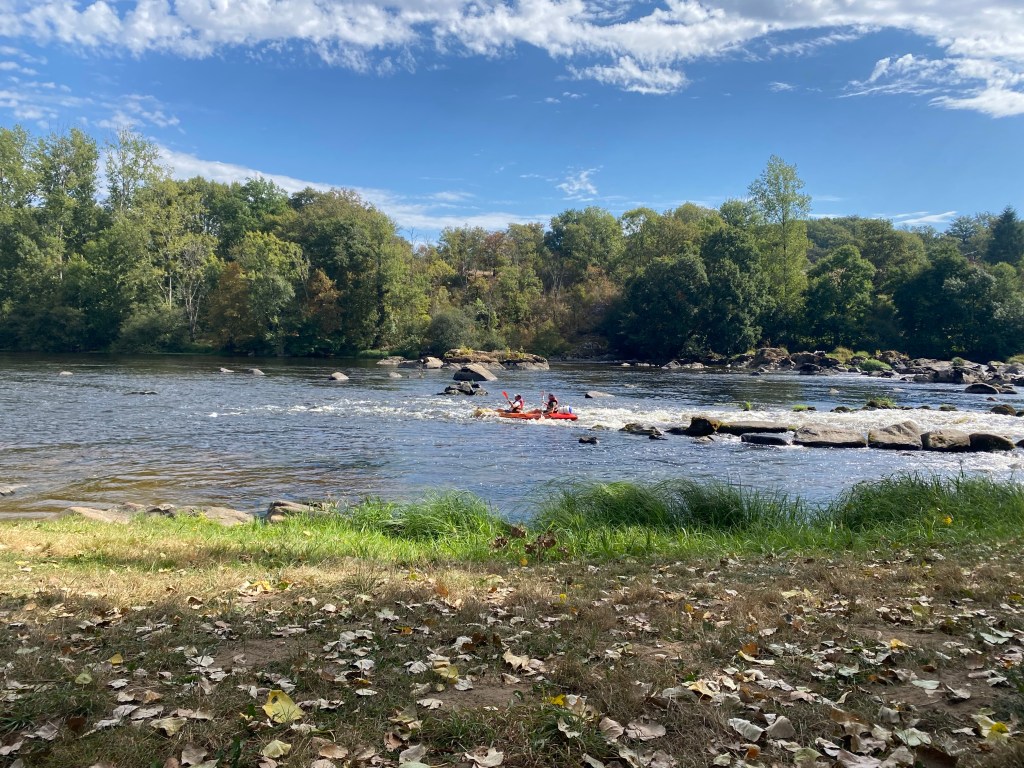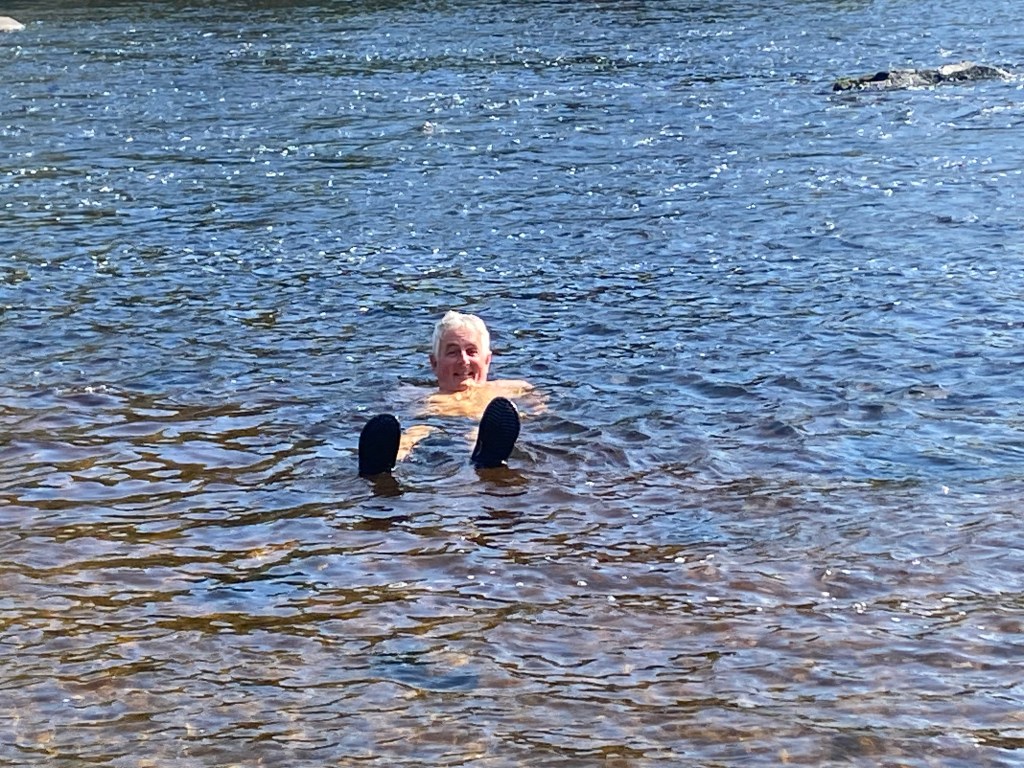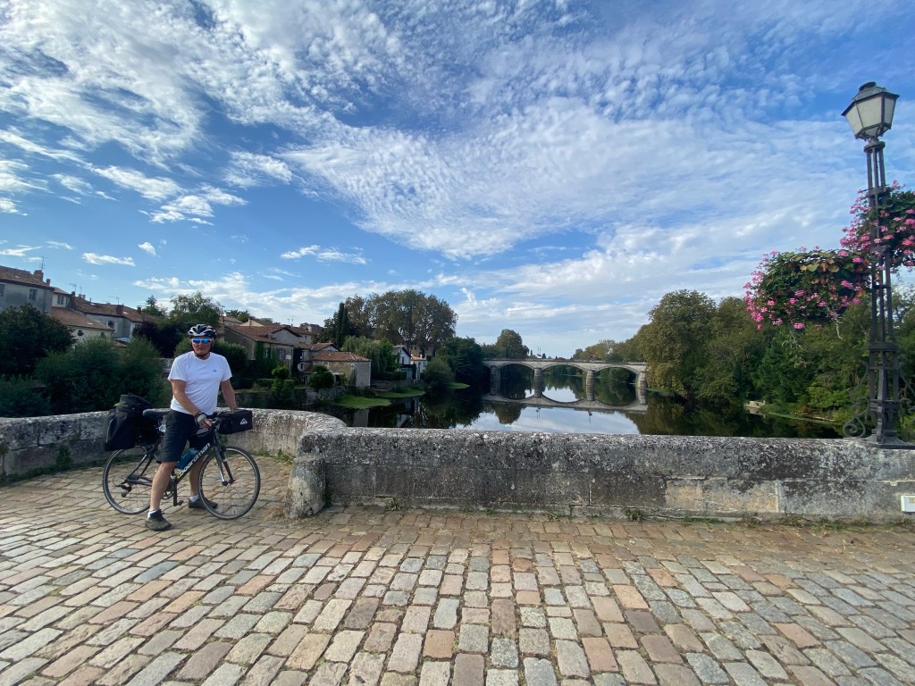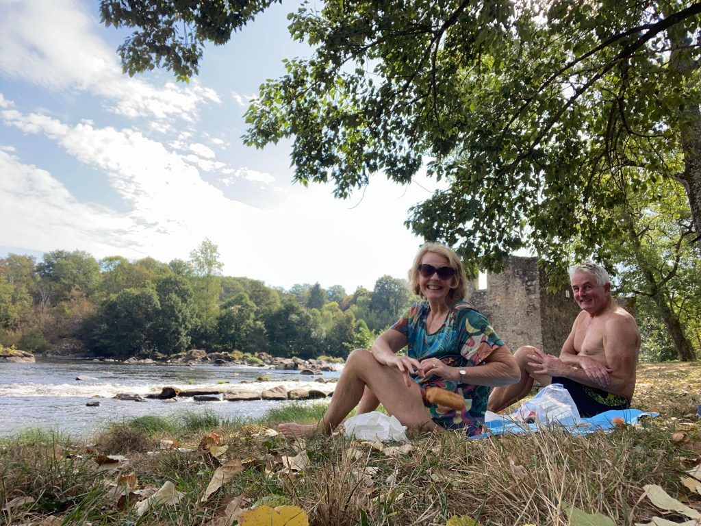 So on we cycled following our chosen route through the absolutely beautiful town of Confolens where lots of extremely fast cyclists wizzed past us smiling and waving as us tortoises. Neil got that familiar buzz and decided to follow their route instead of our flatter route. I warned him about the hills but he’s so super enthusiastic now he didn’t worry. He’s amazing. So up and down we cycled on our detour generally along the river Vienne. It felt like the best cycle day yet as we crossed the river at various bridges. Then inevitably, Neil stopped and hung precariously over the edge of a particularly high bridge trying to find a spot to swim. It all looked pretty dangerous to me, so I took out my phone and found a nearby campsite on the river guessing we could swim there. It was beautiful as we enjoyed our picnic and swims and we stayed far too long but it was worth it.