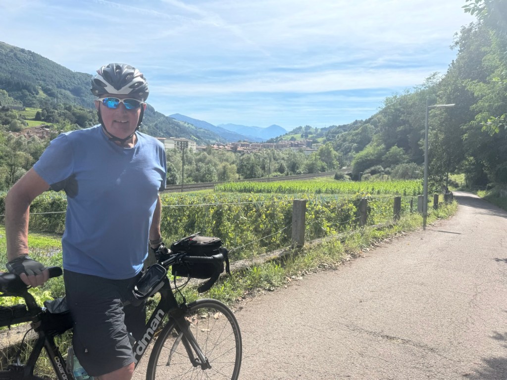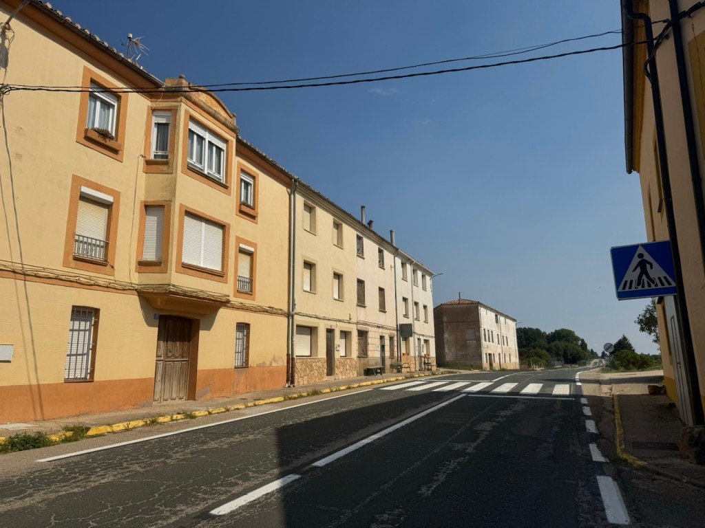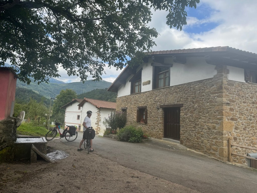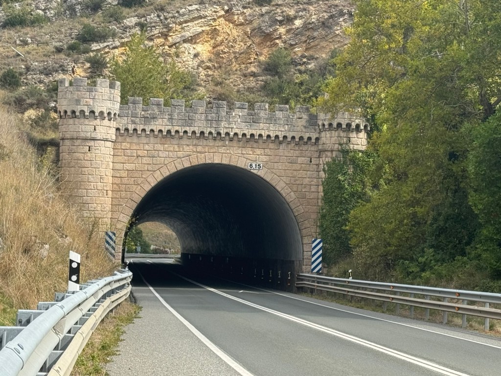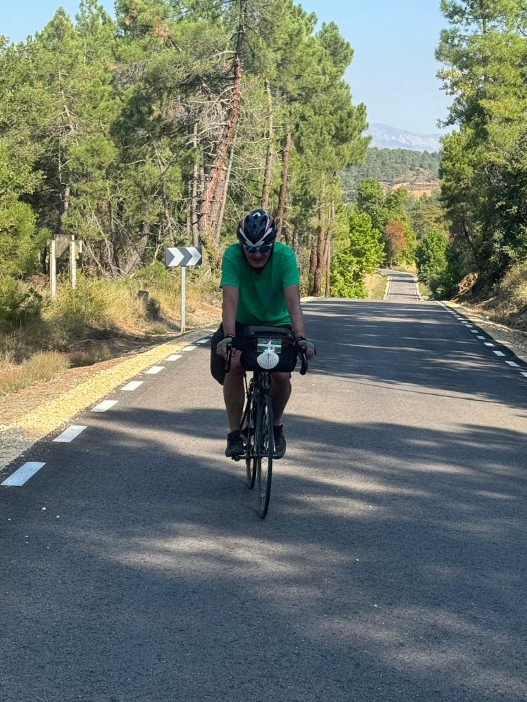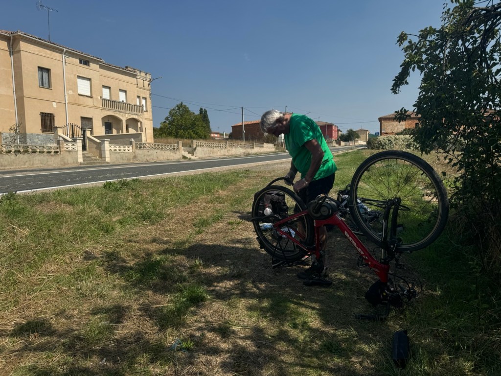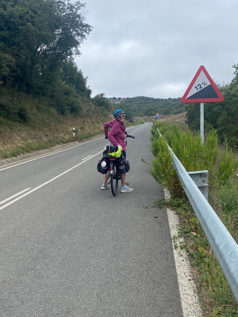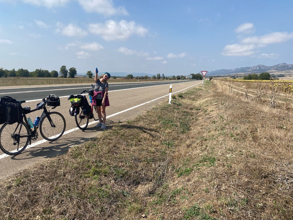 Today started (rather harshly) with a long, long hill and our day ended with an even longer hill, with more hills along the way, so now it feels far more than 49 miles. The final hill was a real challenge in the heat but with the prize of an absolutely stunning village at the end. We crossed open plains and cycled through quirky tunnels cut through mountains. We looked forward to cycling through ‘Miranda de Ebro’ as it’s such a lovely name, but were disappointed to find it was busy and dense with factories and noisy roads, bearing no resemblance to its beautiful name. At the start of the day I felt a little ominous about the rain clouds over the mountains, but by lunchtime they cleared giving us blue skies over vast plains full of sunflowers as the day heated up. No complaints! And I had a yet another puncture in a rather desolate and probably deprived area. A little old lady walked down the empty street in the distance while Neil fixed my bike so I took a photo. And finally the last long hill brought us to this beautiful ancient village where they’ve made salt since long before Roman times. It’s steeped in history which we’re about to explore. The Romans certainly have left their mark through most of the places we’ve cycled. We’ve encountered so many long straight road which seem to go on forever. I prefer bends, guessing what might lie around the corner! When we reached our destination, Neil was so hot he headed straight to the nearest bar for a beer while I checked the bikes in etc. He absolutely deserved that beer as it was a 7 km steady climb in the heat. Well done Neil. All in all, a good day.