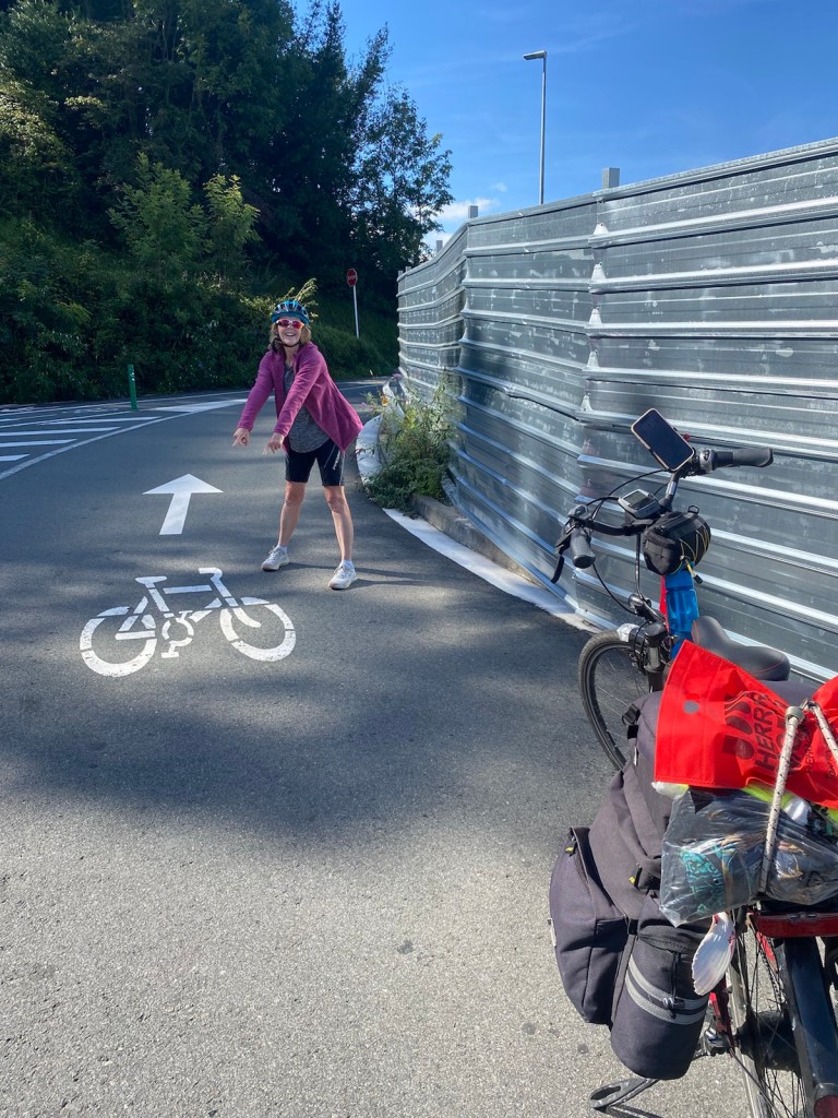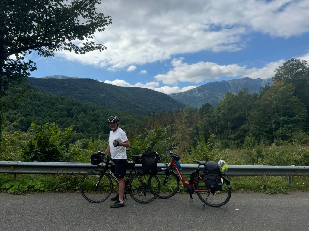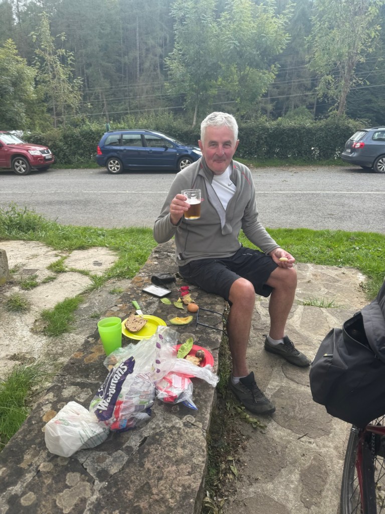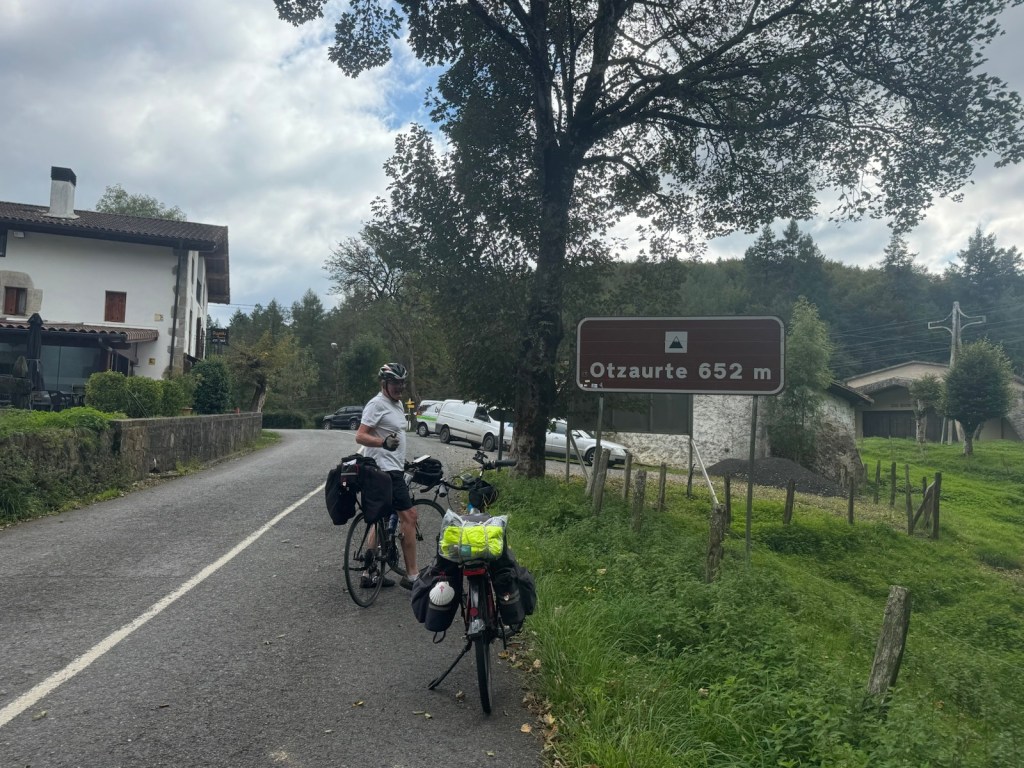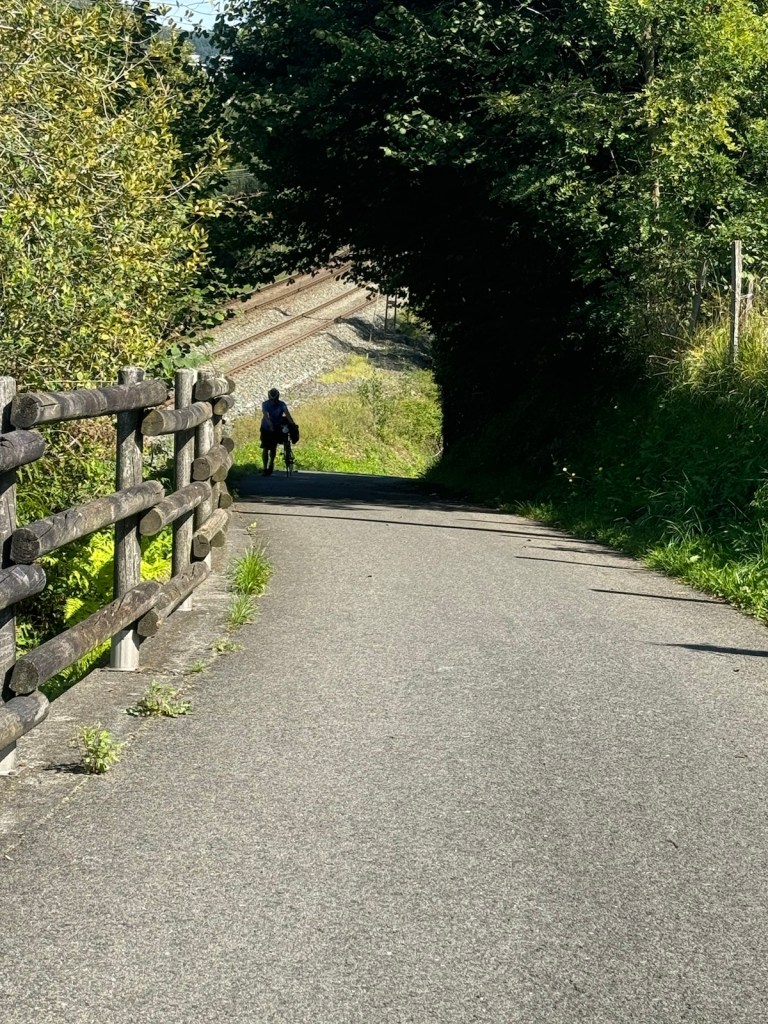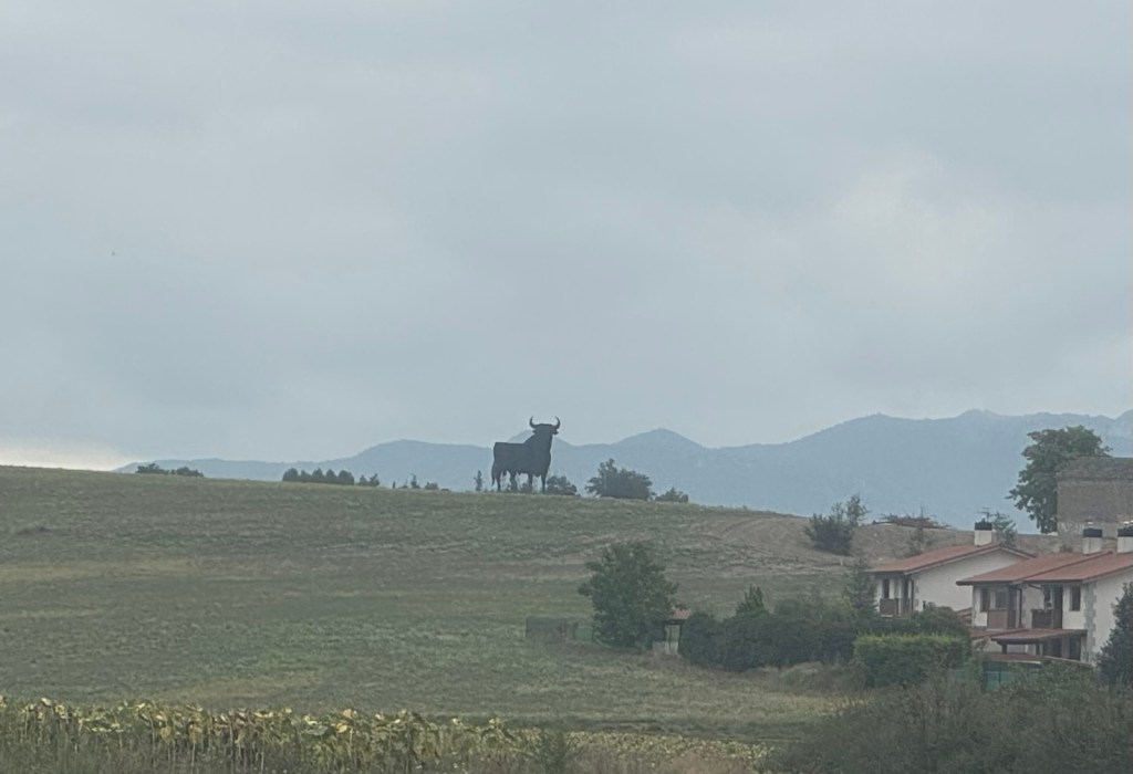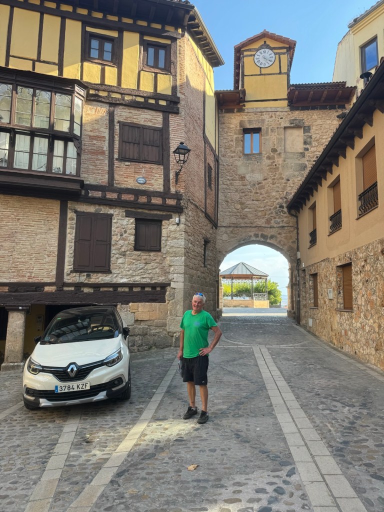 Today started (rather harshly) with a long, long hill and our day ended with an even longer hill, with more hills along the way, so now it feels far more than 49 miles. The final hill was a real challenge in the heat but with the prize of an absolutely stunning village at the end. We crossed open plains and cycled through quirky tunnels cut through mountains. We looked forward to cycling through ‘Miranda de Ebro’ as it’s such a lovely name, but were disappointed to find it was busy and dense with factories and noisy roads, bearing no resemblance to its beautiful name. At the start of the day I felt a little ominous about the rain clouds over the mountains, but by lunchtime they cleared giving us blue skies over vast plains full of sunflowers as the day heated up. No complaints! And I had a yet another puncture in a rather desolate and probably deprived area. A little old lady walked down the empty street in the distance while Neil fixed my bike so I took a photo. And finally the last long hill brought us to this beautiful ancient village where they’ve made salt since long before Roman times. It’s steeped in history which we’re about to explore. The Romans certainly have left their mark through most of the places we’ve cycled. We’ve encountered so many long straight road which seem to go on forever. I prefer bends, guessing what might lie around the corner! When we reached our destination, Neil was so hot he headed straight to the nearest bar for a beer while I checked the bikes in etc. He absolutely deserved that beer as it was a 7 km steady climb in the heat. Well done Neil. All in all, a good day.