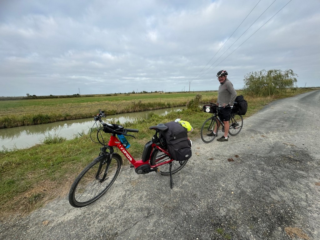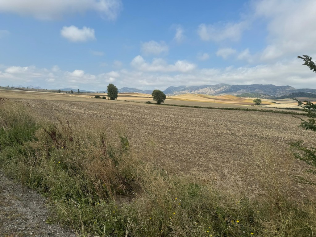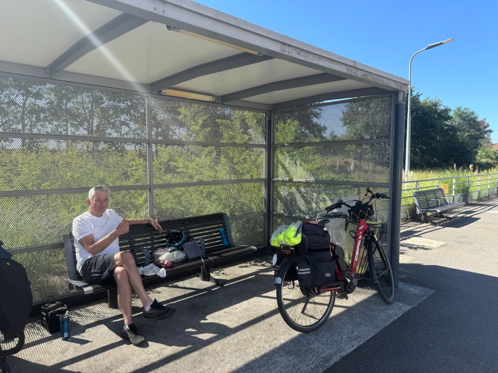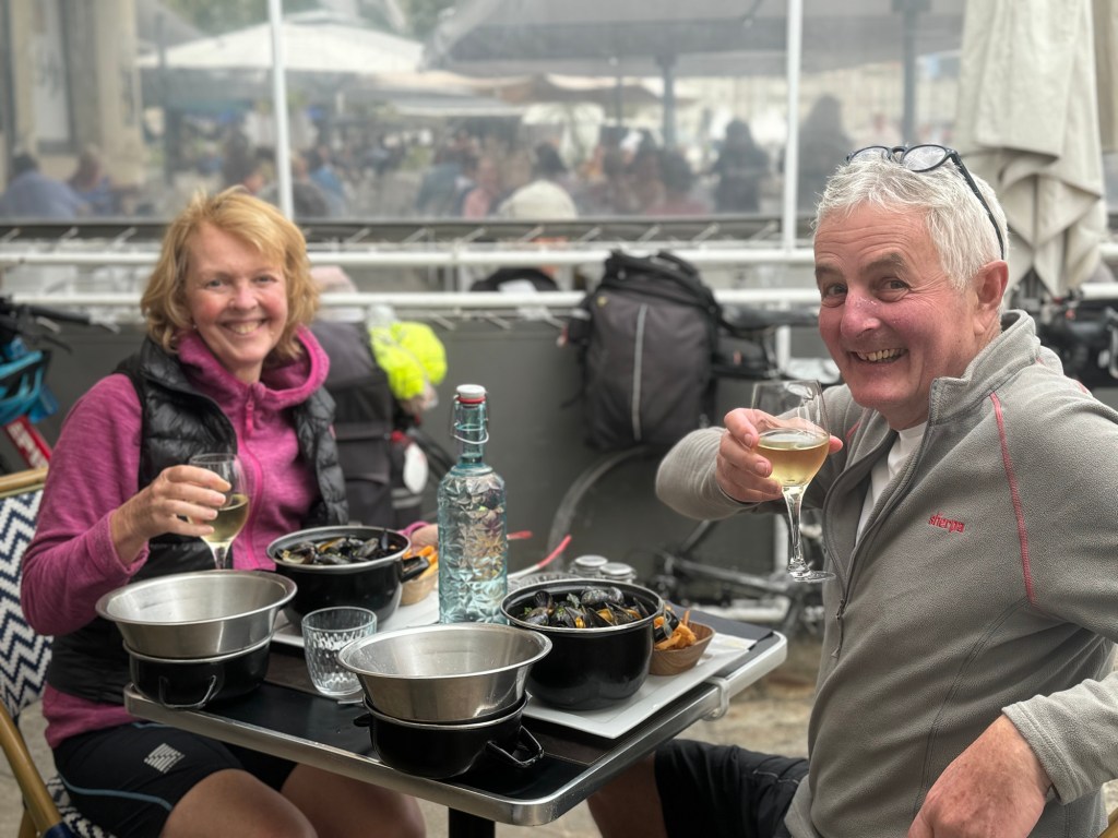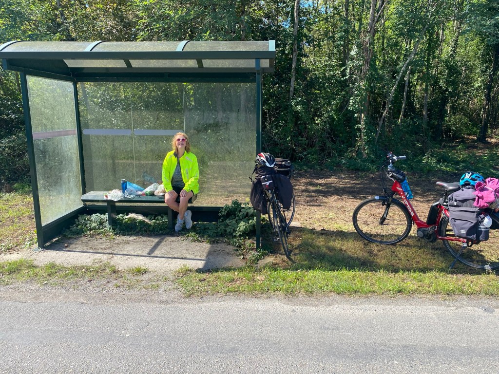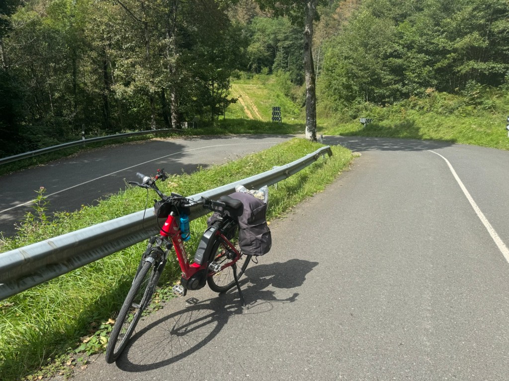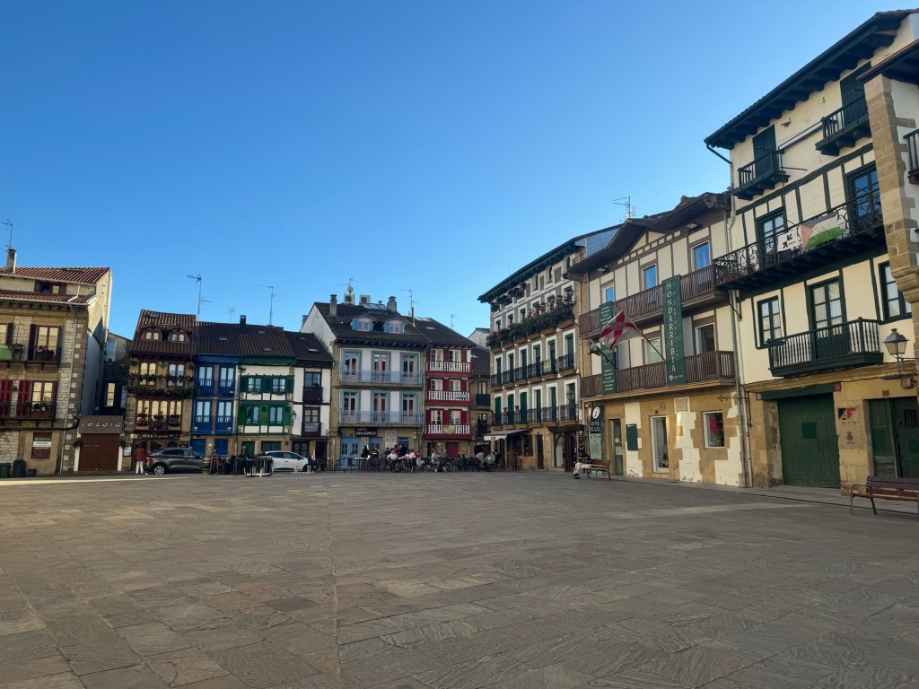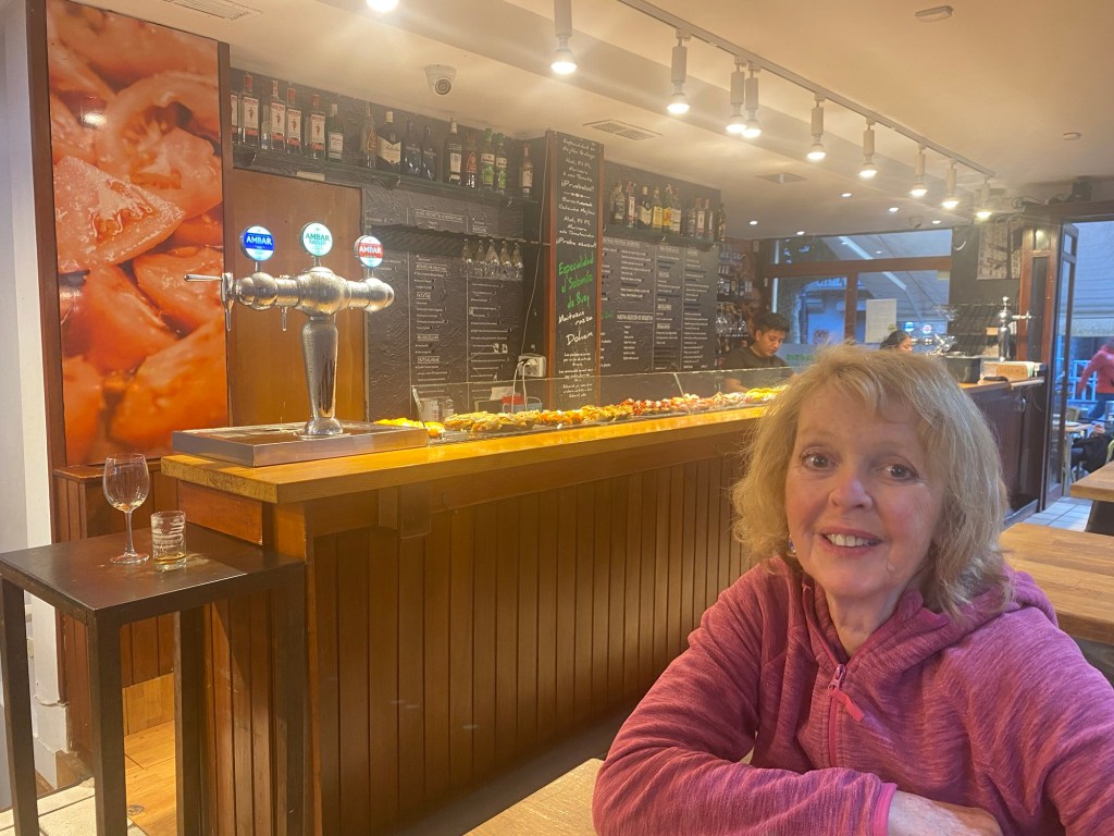 Today started (rather harshly) with a long, long hill and our day ended with an even longer hill, with more hills along the way, so now it feels far more than 49 miles. The final hill was a real challenge in the heat but with the prize of an absolutely stunning village at the end. We crossed open plains and cycled through quirky tunnels cut through mountains. We looked forward to cycling through ‘Miranda de Ebro’ as it’s such a lovely name, but were disappointed to find it was busy and dense with factories and noisy roads, bearing no resemblance to its beautiful name. At the start of the day I felt a little ominous about the rain clouds over the mountains, but by lunchtime they cleared giving us blue skies over vast plains full of sunflowers as the day heated up. No complaints! And I had a yet another puncture in a rather desolate and probably deprived area. A little old lady walked down the empty street in the distance while Neil fixed my bike so I took a photo. And finally the last long hill brought us to this beautiful ancient village where they’ve made salt since long before Roman times. It’s steeped in history which we’re about to explore. The Romans certainly have left their mark through most of the places we’ve cycled. We’ve encountered so many long straight road which seem to go on forever. I prefer bends, guessing what might lie around the corner! When we reached our destination, Neil was so hot he headed straight to the nearest bar for a beer while I checked the bikes in etc. He absolutely deserved that beer as it was a 7 km steady climb in the heat. Well done Neil. All in all, a good day.