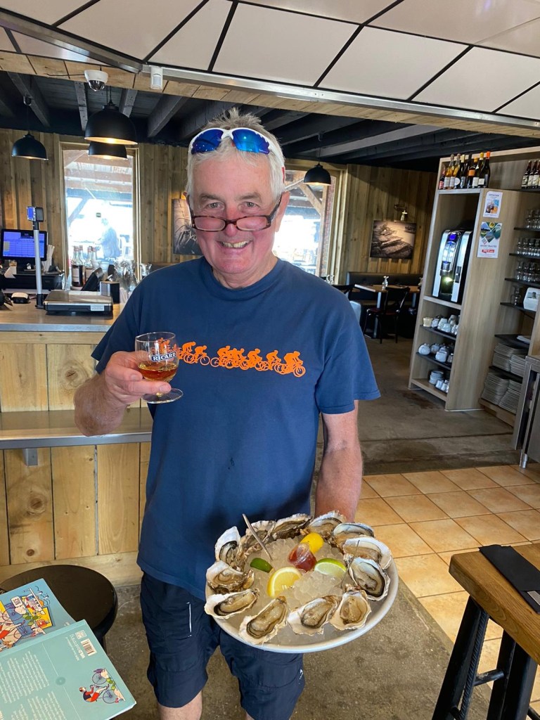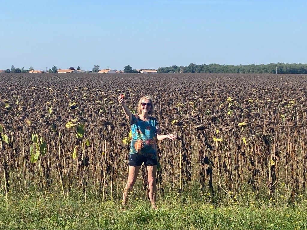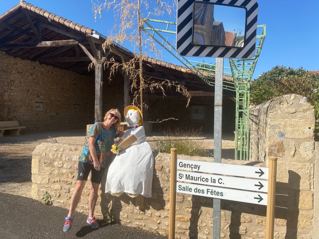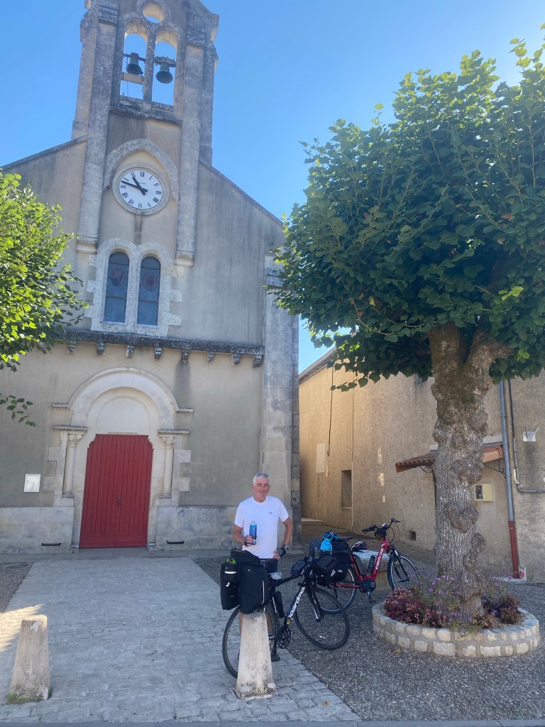 What a classic Neil/Ceri day full of twists, turns and surprises. We started off before dawn as usual, cycling up hill, singing with the larks as we watched the glorious sunrise. About 5km in Neil realised he’d left his credit cards at the hotel! We didn’t want to cycle that hill again, so we decided to keep cycling and I emailed to ask them to post them on. Amazingly, there was a bar open early Sunday morning in Lessac with a few ruddy faced characters propping up the bar sipping their first Rose of the day as we enjoyed our coffees and croissants. With no reply to my email, I called the hotel. The wonderful lady from the hotel found the cards, jumped in her car and drove a good 15 minutes to find us, leaving her hotel in the hands of the cleaning lady. Wow. What a kind lady – great fun too.