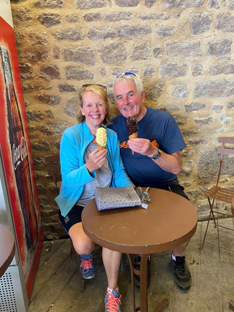 Then the best part of our day was reconnecting with Leslie and Jonathan, the couple we’d swam with in the channel on day 1!! What a wonderful surprise it was. Amazingly, we’d all stayed in the same town last night. They are faster than us but had had bike problems so lost a day. It was such a fun reunion over beers, then we parted ways again as they head home tomorrow. We’re now staying in a lovely farmhouse B&B with a pool. The rain started just as we turned in…. Perfect timing